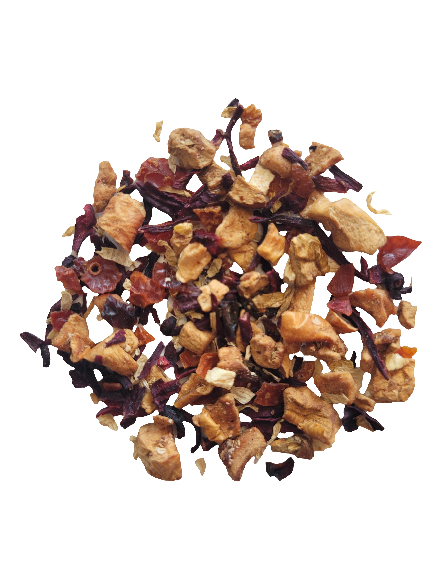 Apple, rosehip, peach pieces, hibiscus, chamomile, natural flavors