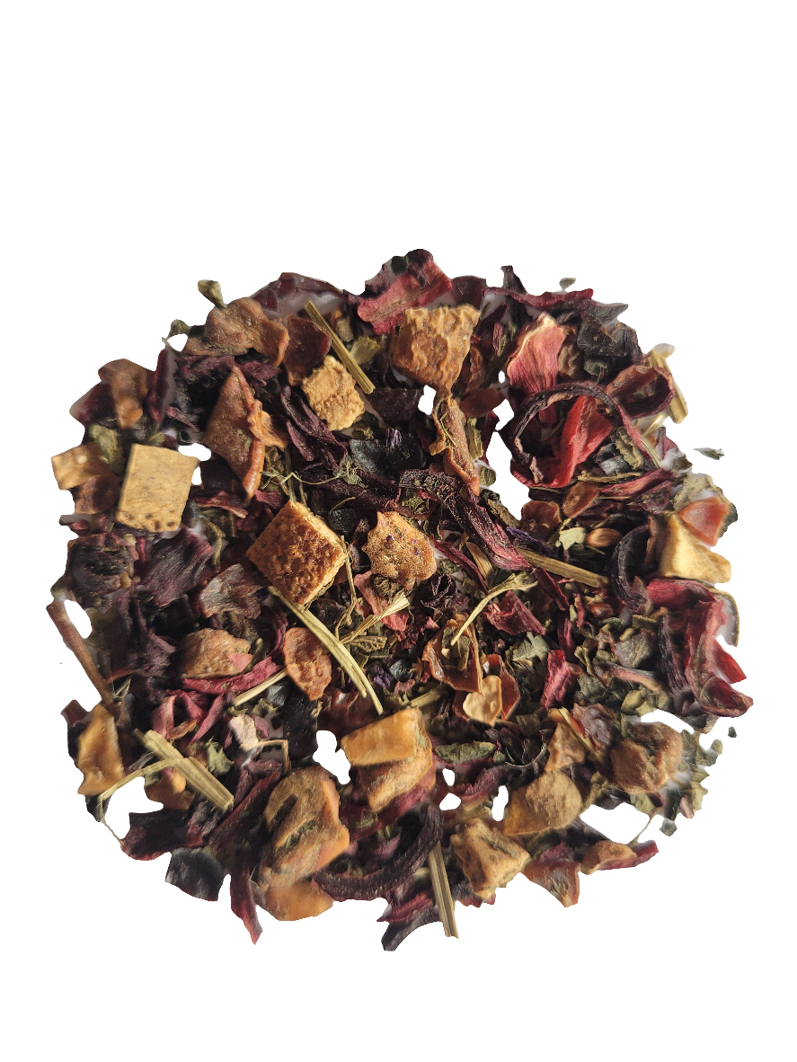 Apple, hibiscus, rose hip, orange peel, nettle leaves,blue mallow flowers with natural flavors