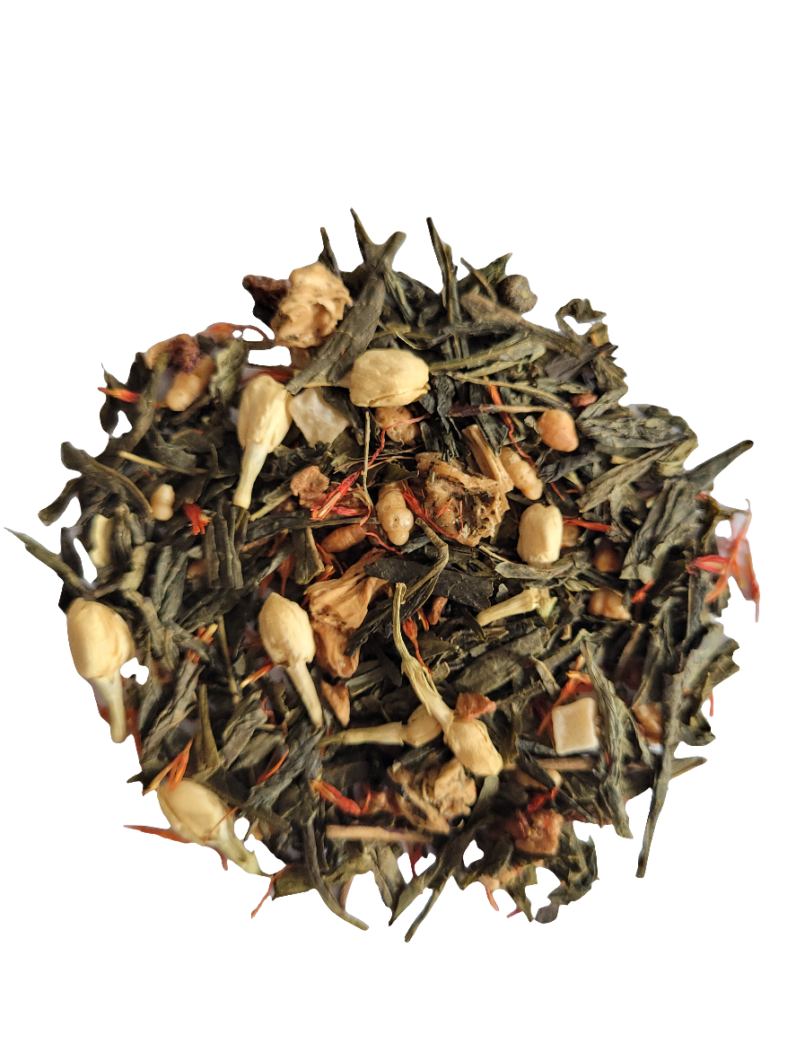 Green tea, Genmaicha (green tea,rice kernels,popcorn) pineapple, mango,strawberry,safflower,Jasmine flowers and natural flavors