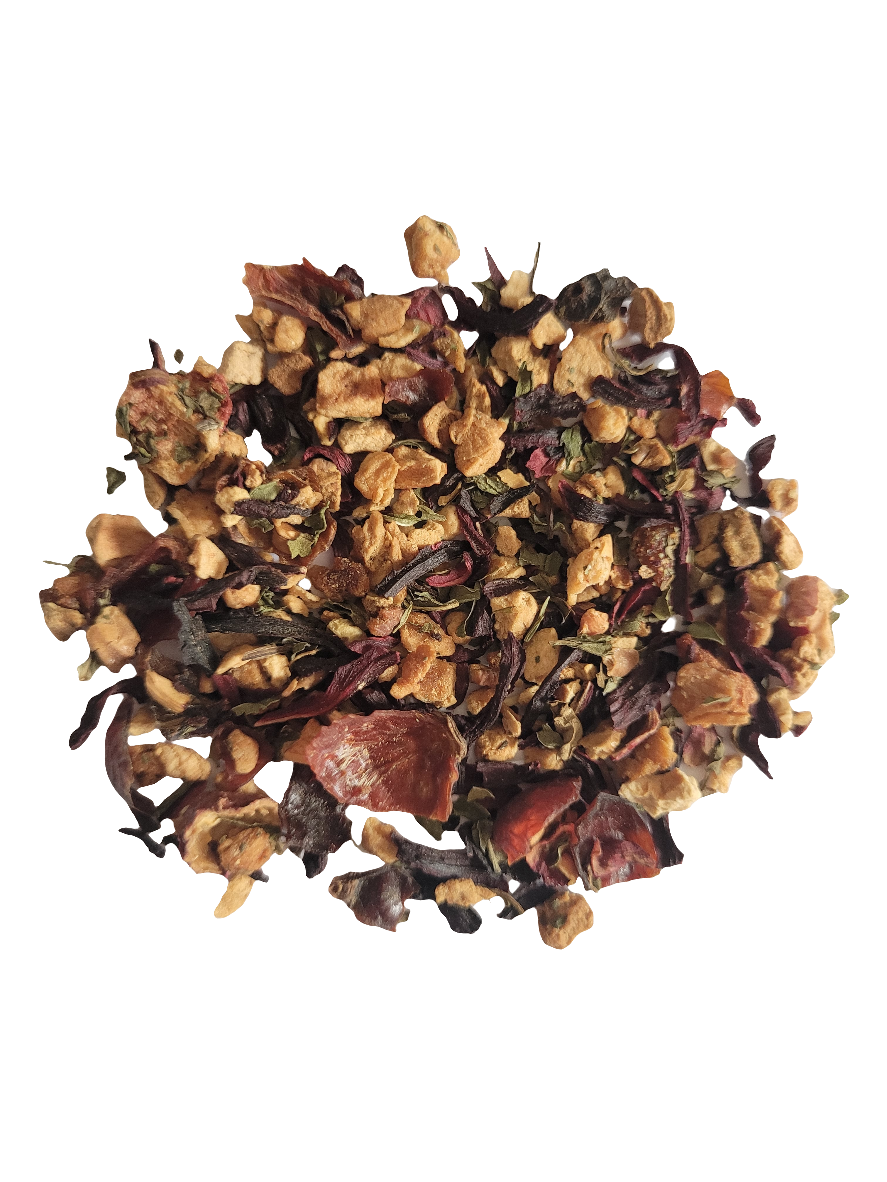 Apple, hibiscus, rose hip fine cut, strawberries, mint, natural flavour