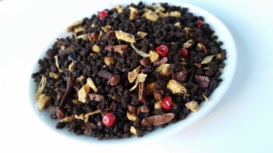 Black tea, ginger, cinnamon, cloves, red peppercorn, chili, star anise, cocoa pieces, natural flavor
